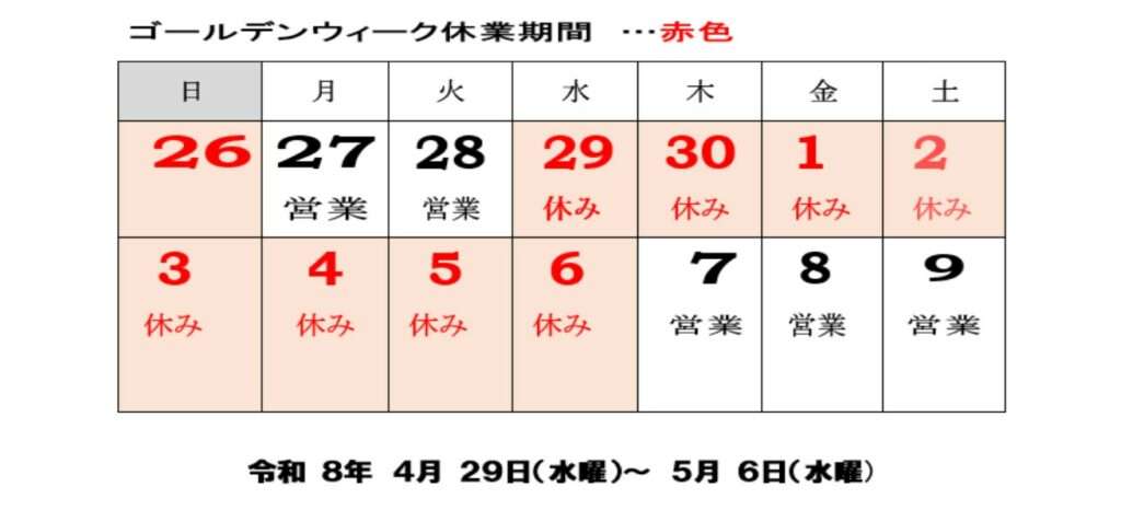 ゴールデンウィーク休暇のお知らせ
